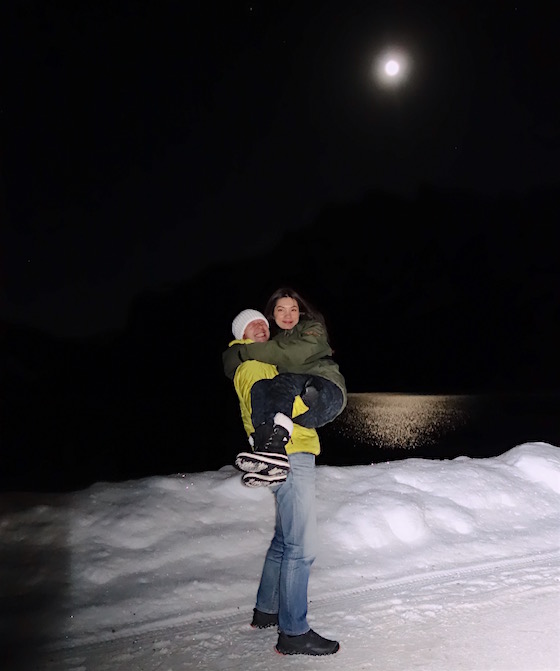 湖に映る月明かりがとても印象的でした。氷点下の空気感もあって、どこか厳かな雰囲気もあり… せっかくなので今回一緒に旅をしているヒットミーさんをお姫様抱っこさせていただきました。