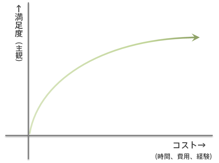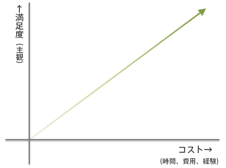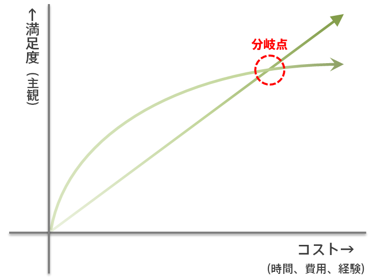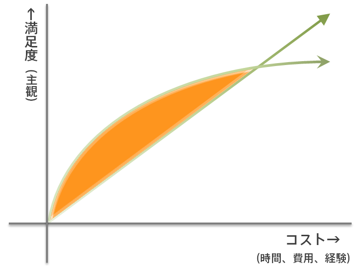 ということで、コスパが高い、いい状態ってのは、その分岐点までの、下の図でいうところのオレンジ色の部分の時のことだと思うわけです。支払ったコストよりも満足度が高かった、というね。