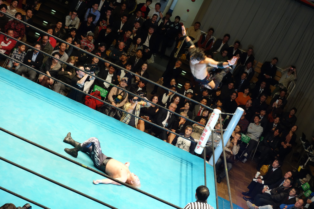 こちらは三代目タイガーマスク、金本浩二のムーンサルトプレス!