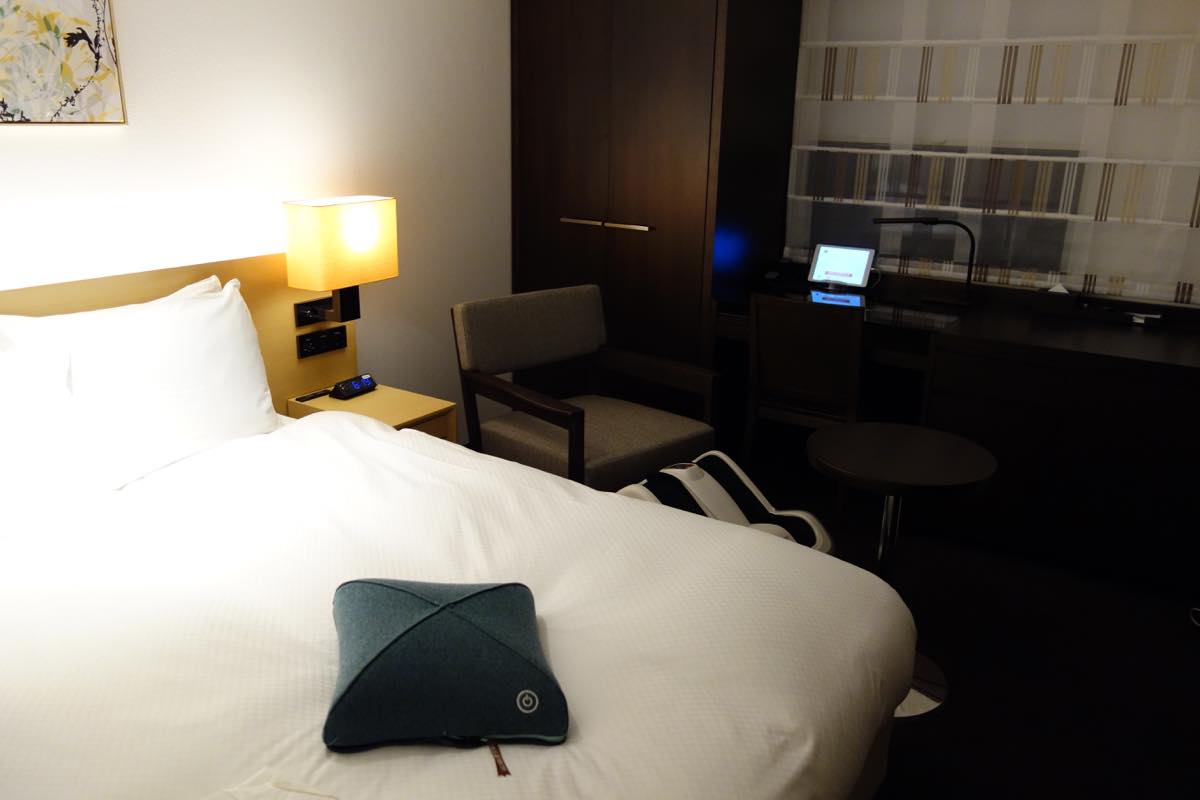 客室はこちら。ダブルな部屋かな? ベッドにはマッサージクッション。
