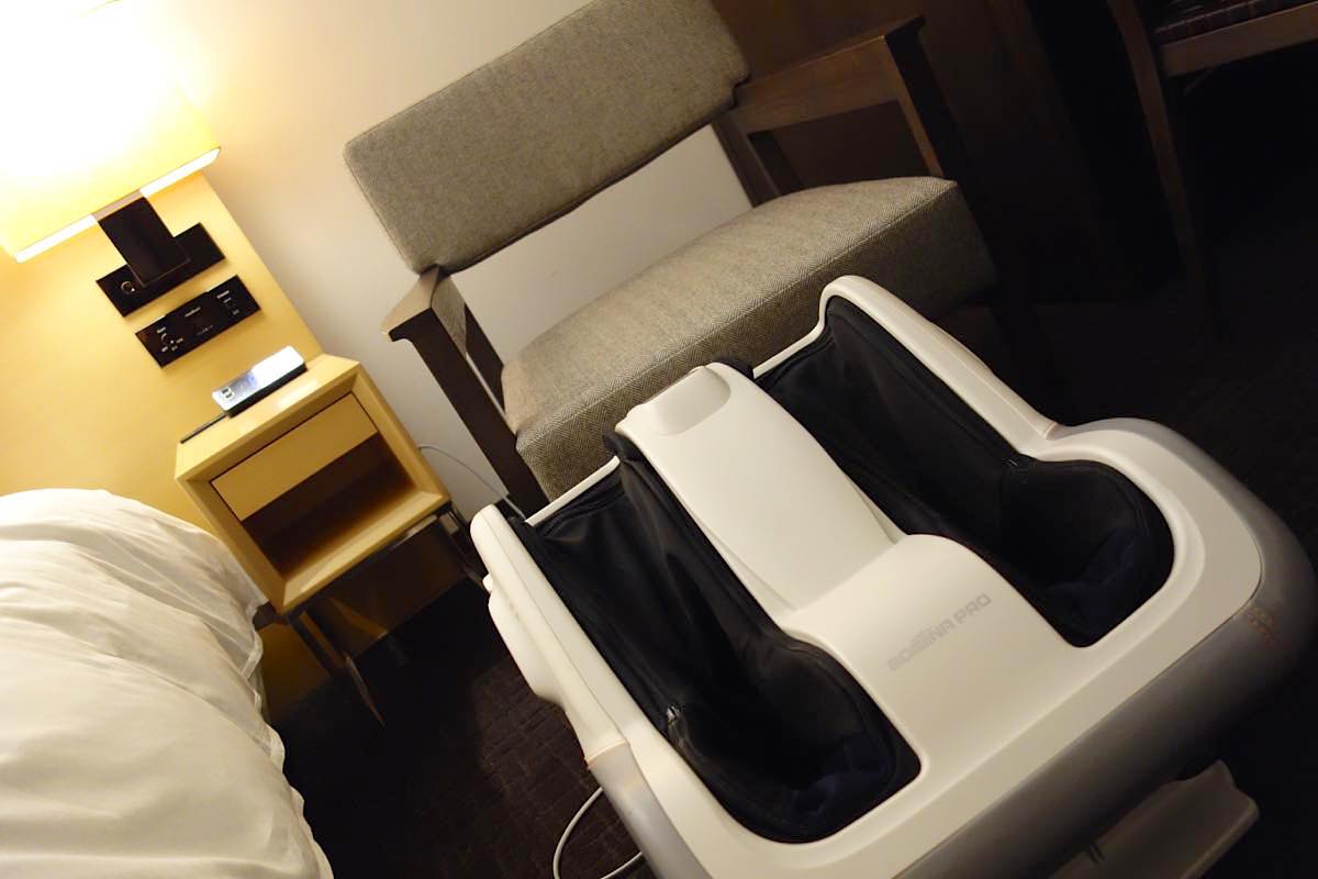 そして奥にはゆったりめの椅子とオットマン代わり(?)にマッサージャーがあります。いつもよりも歩くことが多い旅において、フットマッサージャーはありがたい!