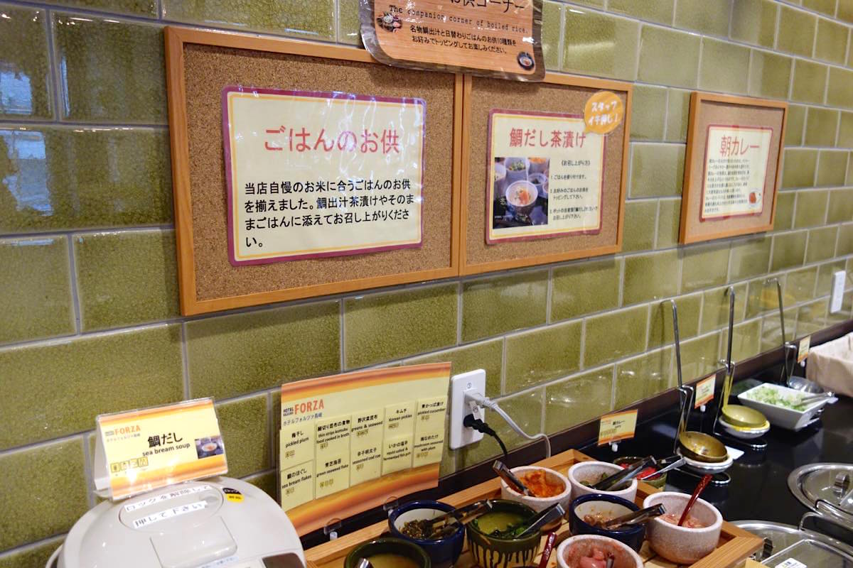 ブッフェ形式になっていて、和食と洋食でバリエーションがあります。僕は和食系からせめてみました。ご飯は白飯と雑穀米のふたつ、海苔とか鯛のほぐしとか明太子とか、10種類のご飯のお供もありました。お茶漬け用の出汁やカレーもありました。