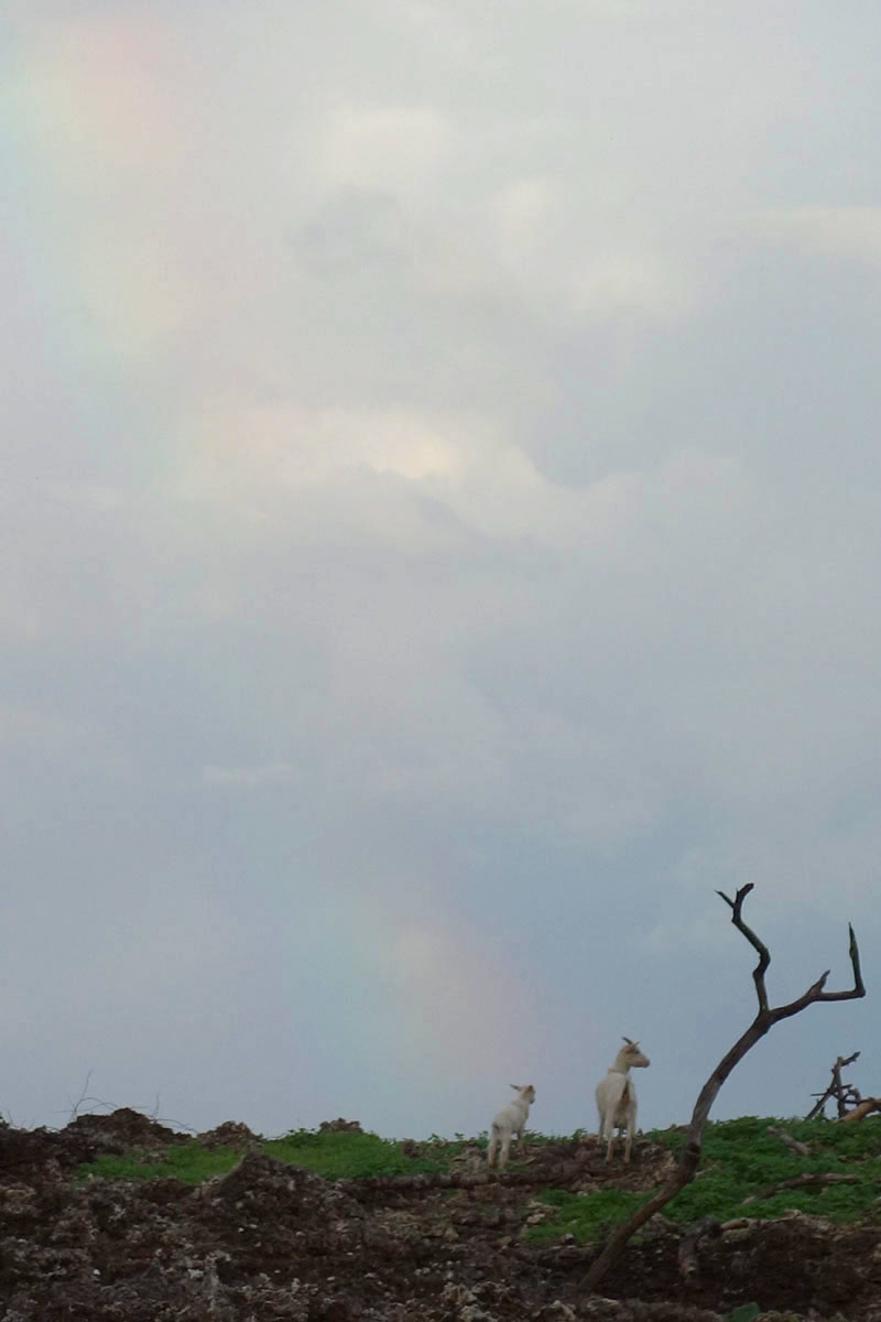 山羊と虹。ゴート&レインボー。繋がれている山羊と野生の山羊が同居する島、鳩間島。