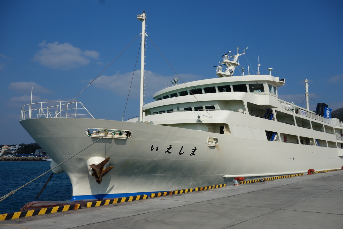 フェリー乗り場は那覇から車で2時間弱の本部港にあります。港に着くと、伊江島行きのフェリーがいましたが、これが思ってたよりもずっとデカい!