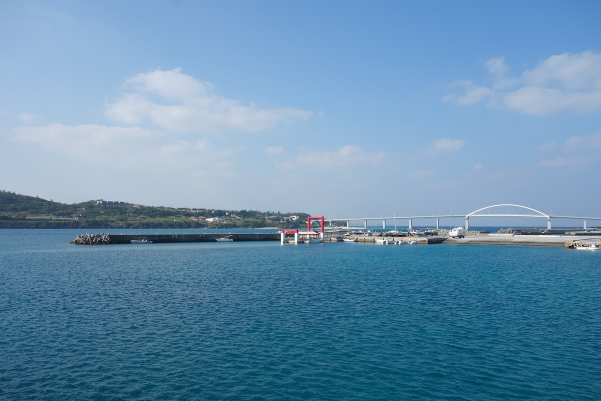 あの橋の下をくぐって、30分で伊江島へ。