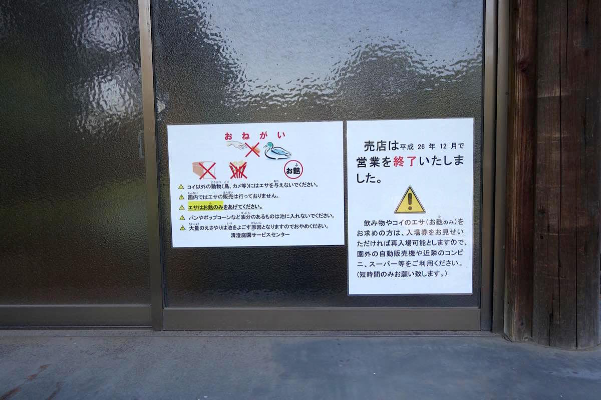 中に入ってすぐ右側に以前は売店があり、そこで鯉や亀にあげるお麩が変えたんですが、販売は終了していました。なので、清澄庭園をガッツリ楽しみたい方は、どこかでお麩を仕入れてから遊びに行ってください。
