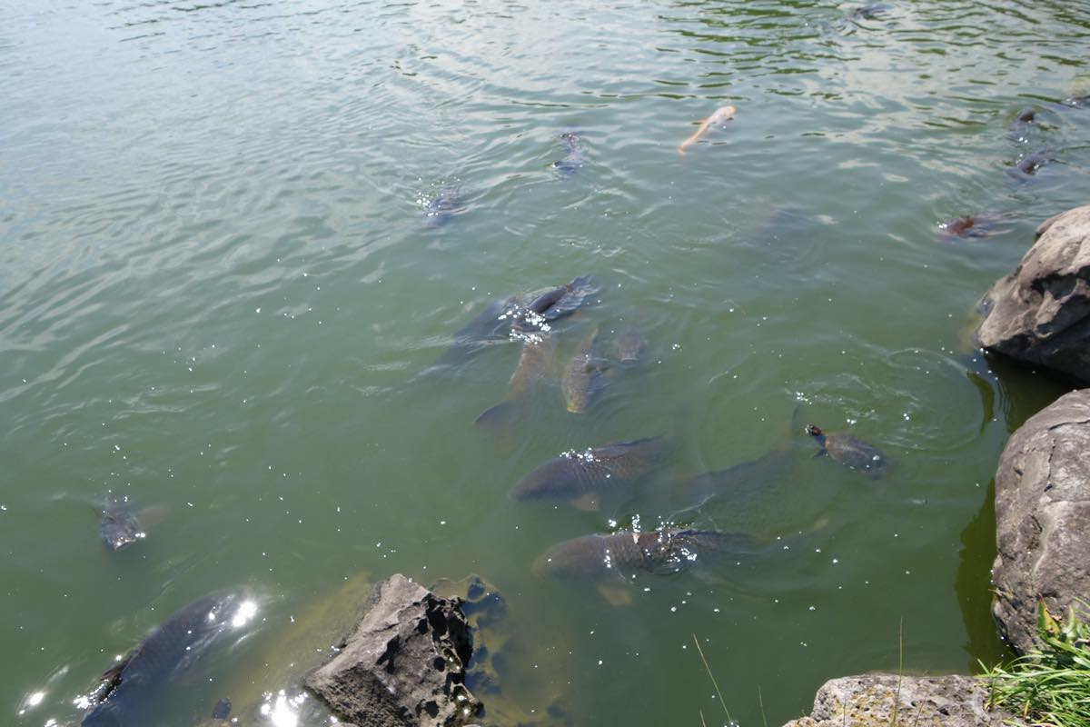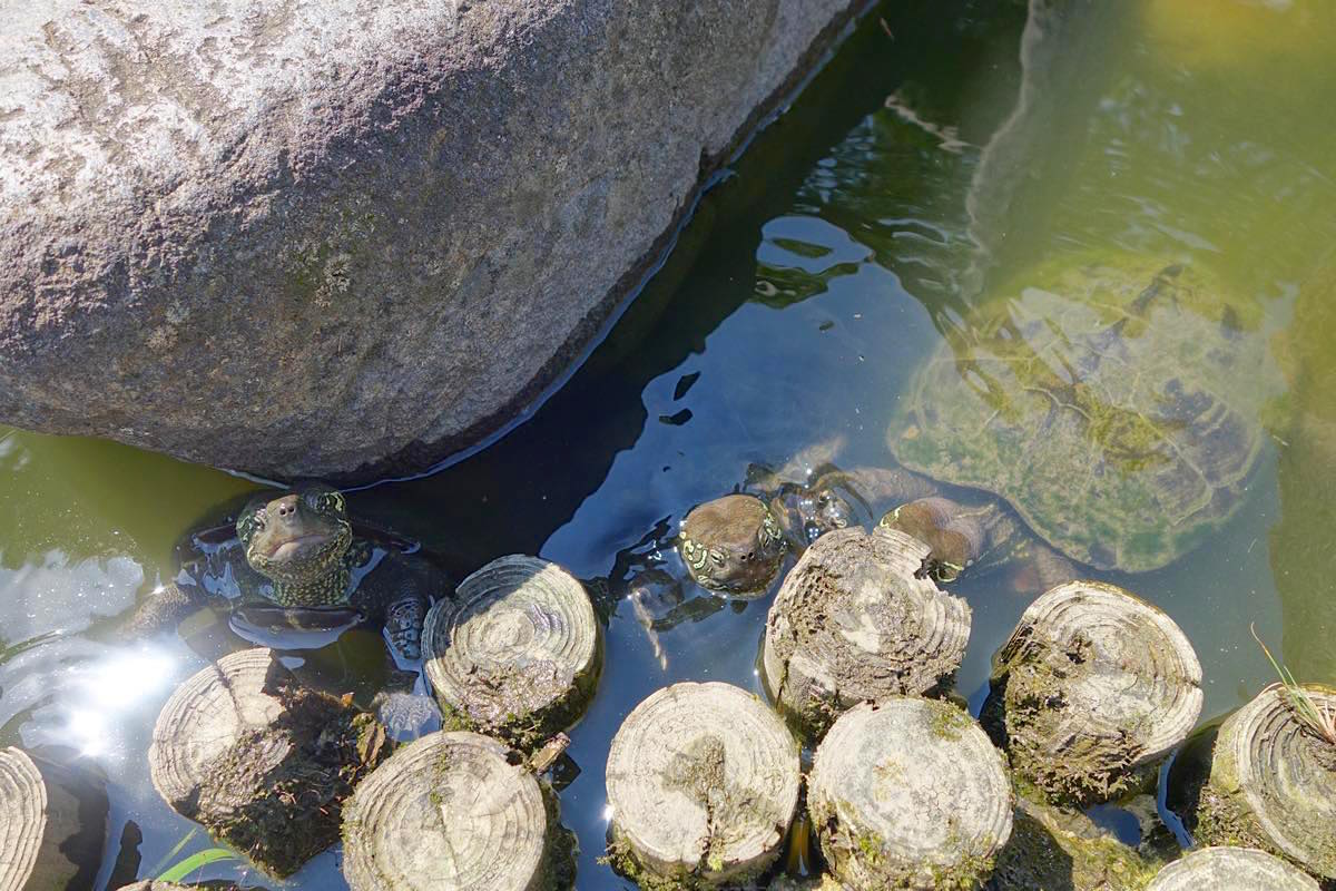 池ではかなり大きい鯉が泳ぎ、岸辺では亀が甲羅干しをしています。