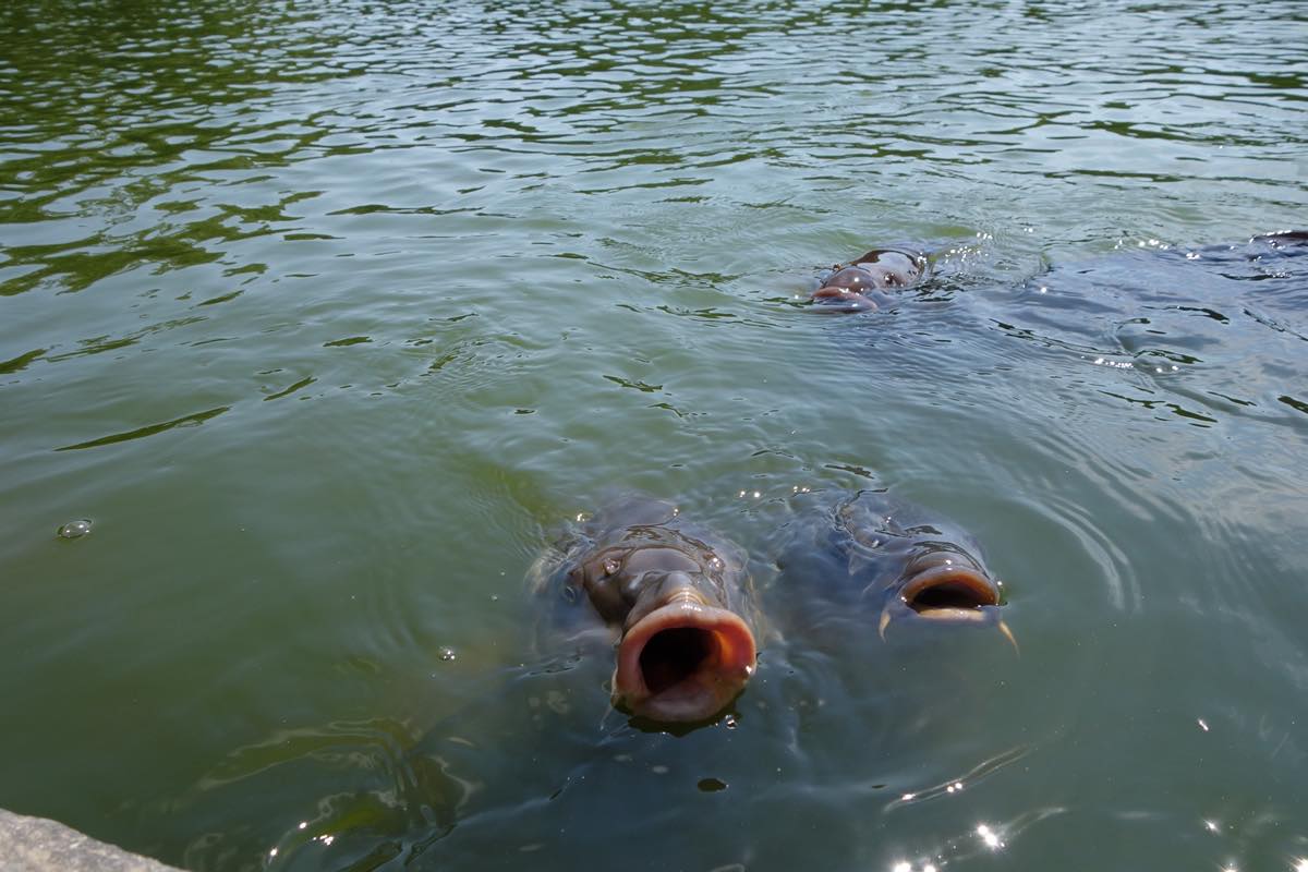 池の生き物が、ちょっとでもお麩をあげている人がいると判断した場合、その人の周りに鯉も鴨も亀もすっぽんも集まってきます。