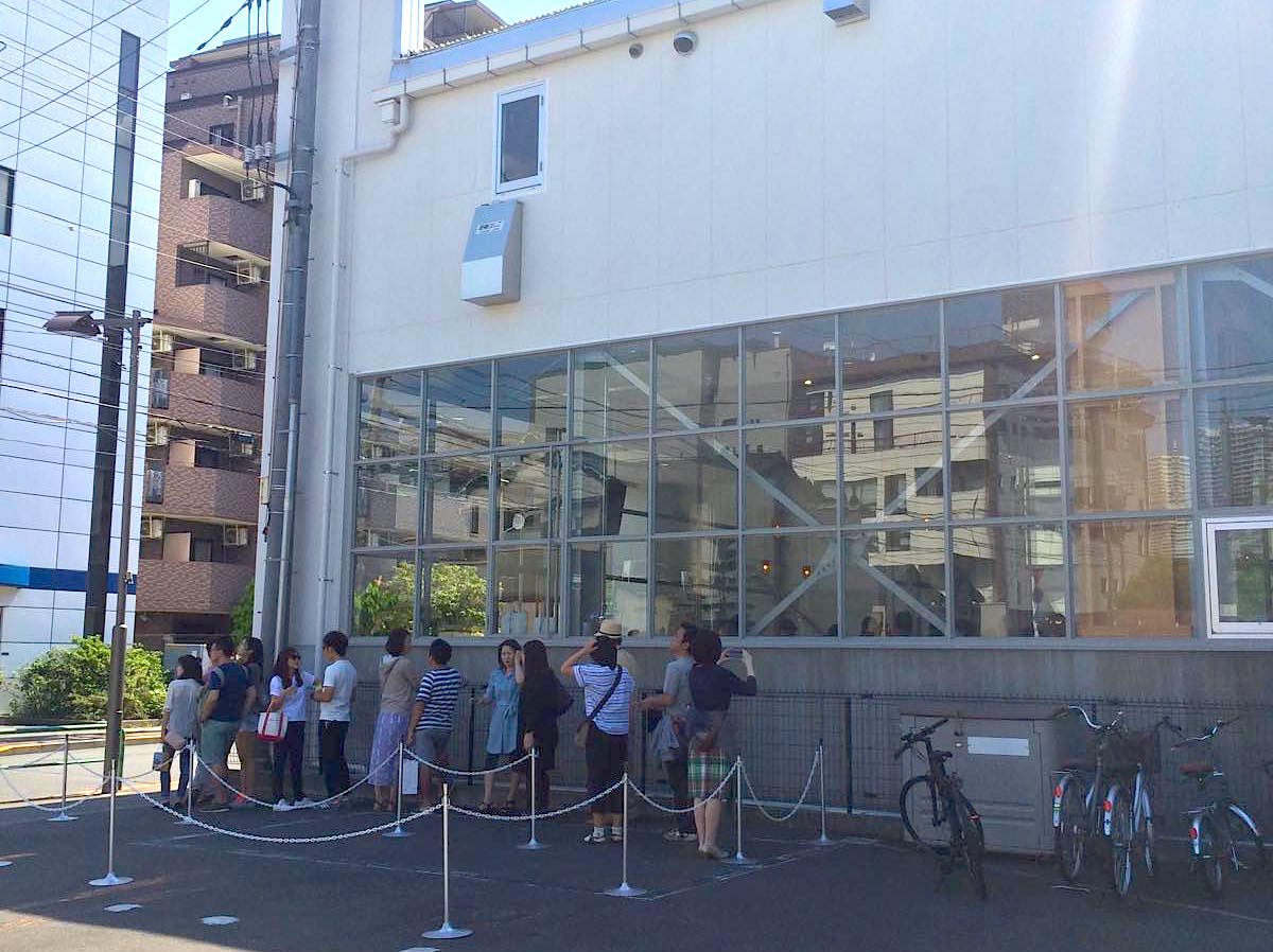 清澄庭園から徒歩8分くらいの場所にある「ブルーボトルコーヒー」、週末はまだ並んでいました… これはお店の側面ですが、正面やお店の中にも並んでいましたよ。