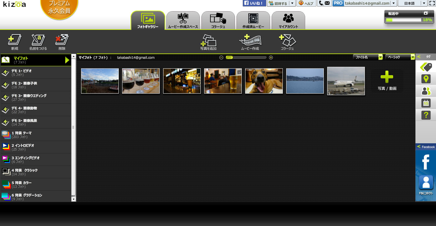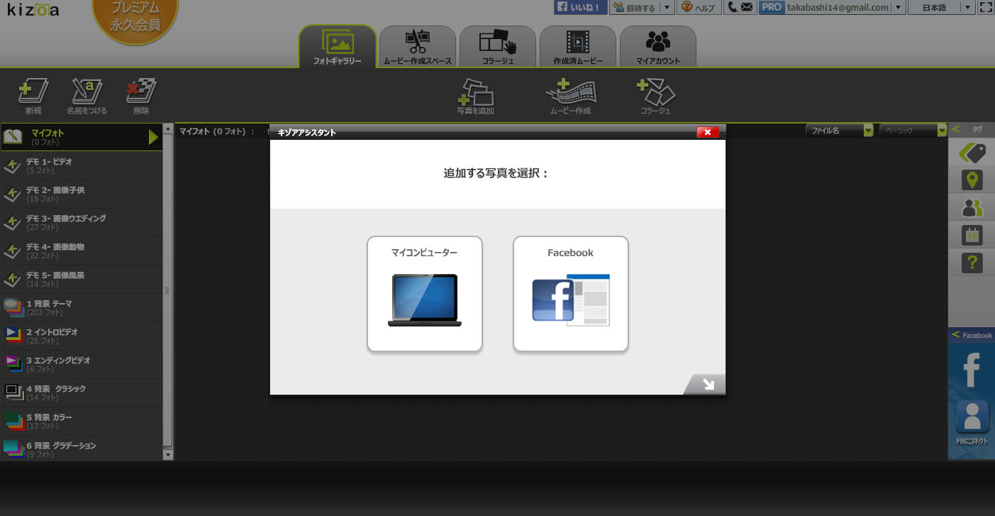 続いて、写真や動画の素材を登録します。パソコンからアップロードすることもできますが、Facebookにアップしたものも使えます。なにげにこれが便利な気がします。スマホからFacebookでシェアした写真を Kizoa で使えば、パソコンにデータが無くても素材にできるというのは、パソコンの負担にもならないし便利ですね。