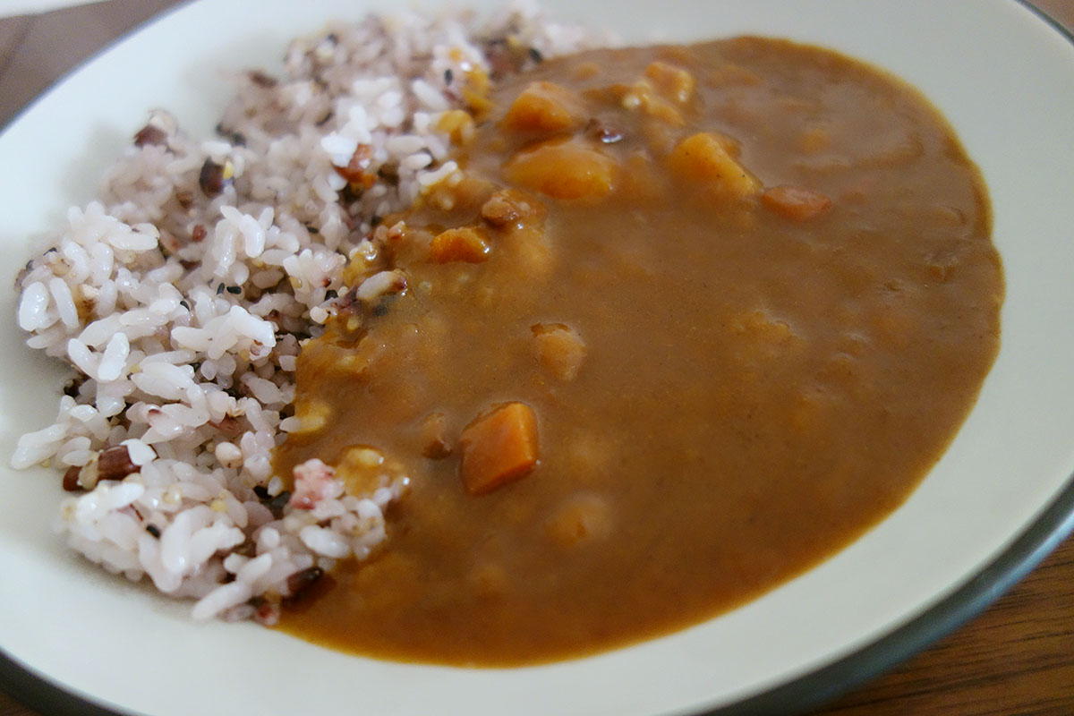 箱からレトルトのパッケージを取り出して、湯煎で温めること5分。ご飯にかけたら完成です。五穀米なので、カレーが目立たずごめんなさい。