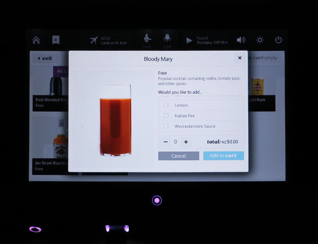 タッチパネルでは、ドリンクやスナックのオーダーも可能で、ハイボールやブラッディマリーはいろいろと細かくオーダーできました。すごい!