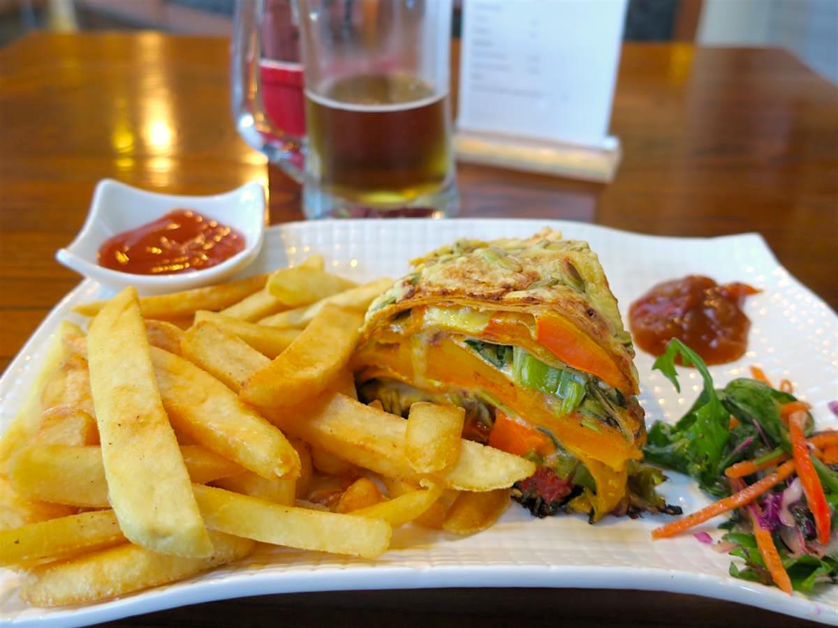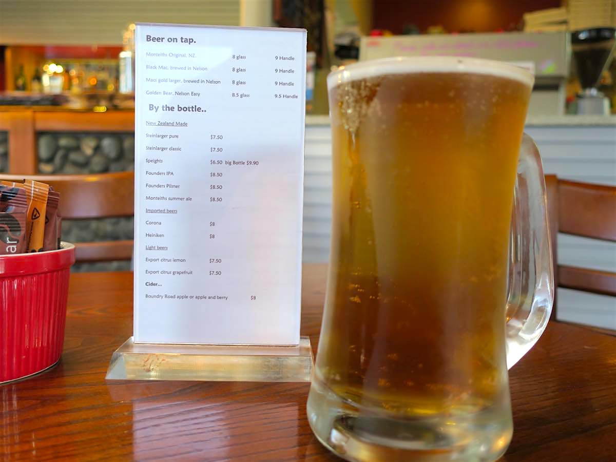夕方だったからか、おばさんたちが何組かコーヒーを飲んでいる感じでした。ビールは、ネルソンからモトゥエカの途中で見かけたブルワリーの GOLDEN BEAR のものを、フードはなんとなくニュージーランドっぽいメニューを頼んでみました。