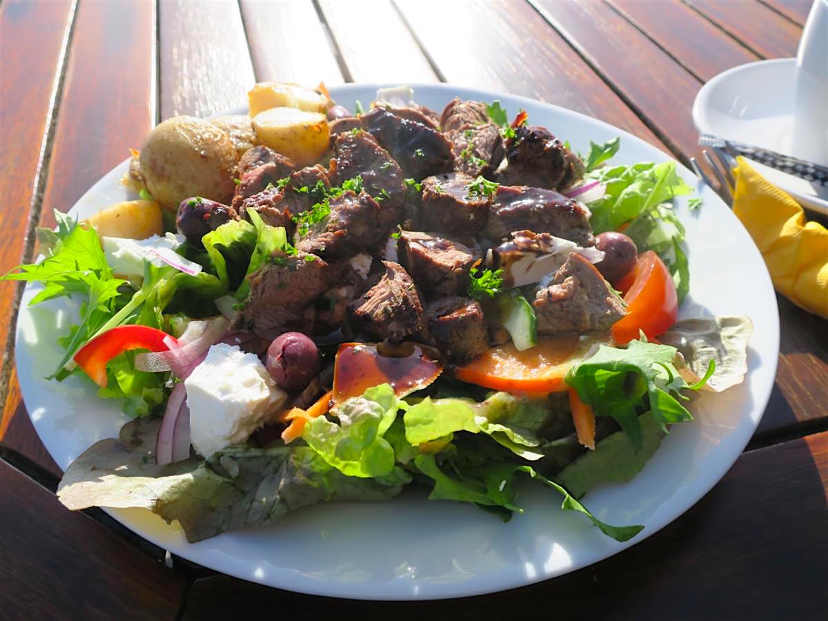 いくつかランチメニューがありましたが、そういえばニュージーランドなのにラムを食べてない、ってことでラムサラダを選びました。こういう時って、どれくらいのボリュームで出てくるかわからないので、選ぶのが難しいですよね。17ドルくらいだったかな?