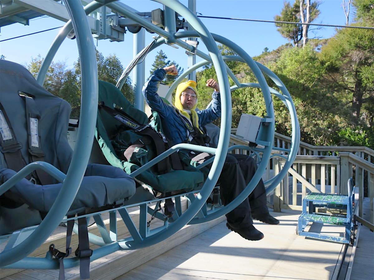 向こうの山のある程度のところまで行ったら、また滑車が開放されて、滑り降りる… という感じです。行きは前向き、帰りは後ろ向きに滑るって感じですね〜。で、僕、勘違いをしていました。このアトラクションって、山のてっぺんからワイヤー伝いにすごいスピードで降りるもんだと思ってたんですが、滑り台ではなく、ブランコ的なものだったんですね〜。スリルは無かったけど、これだけの山の中を、木々の上を滑空することも無いので、いい経験になった、かな?