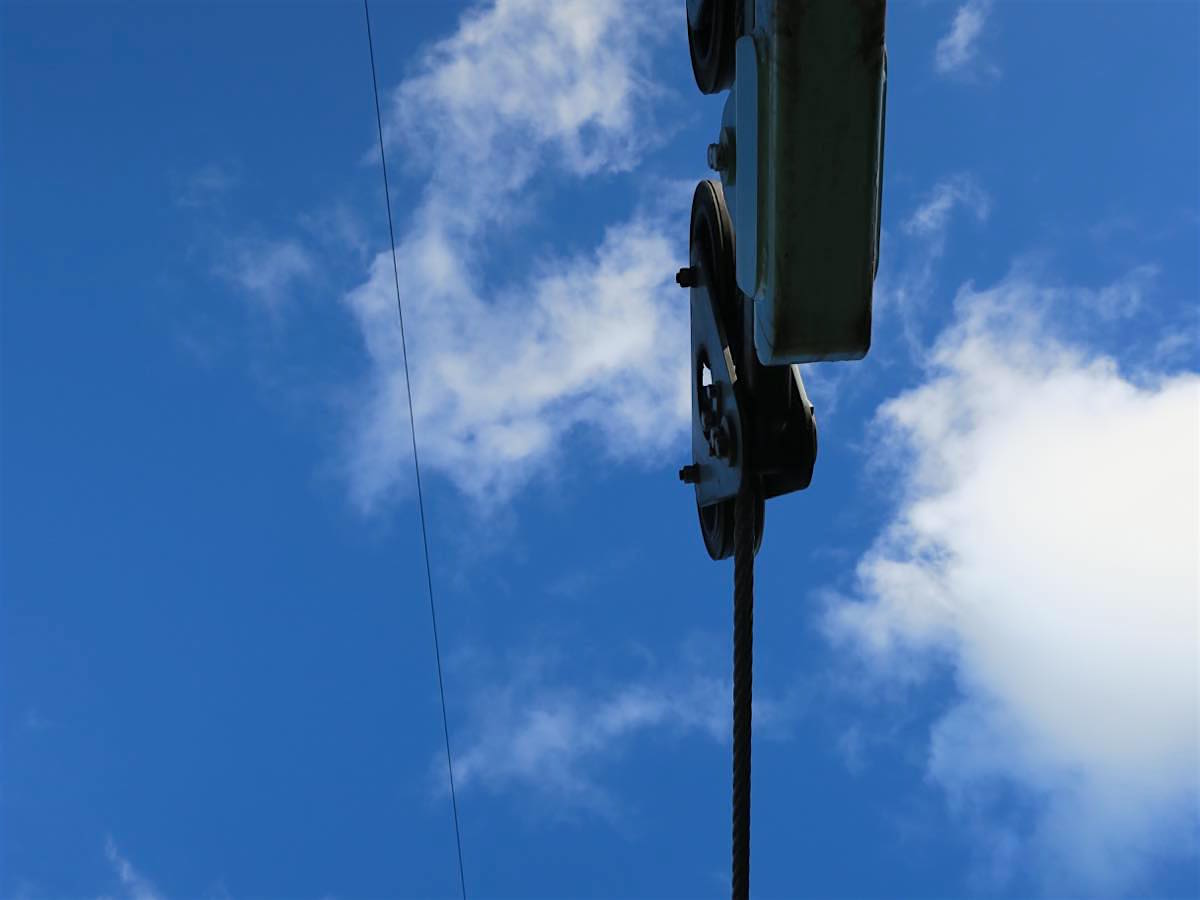 まあ、飛ばないように紐で縛れる帽子ってのはこんな感じなんですかね。で、いよいよ出発! 最初はケーブルは固定されていて、椅子に付いている滑車が回って下るので、結構なスピードが出ます。メーターが付いているのですが、だいたい時速80kmくらい出ていました。で、下りきって、止まったところで滑車が固定されて、ワイヤーを向こう側の山まで引っ張ります。
