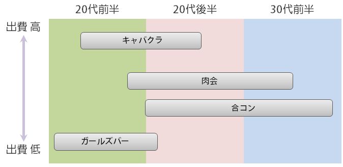 でね、肉会では、27歳くらいの女性と食べて飲んでだったわけですが、これが合コンとなると、最近はもうちょっと世代が上になり、ガールズバーとかキャバクラだと世代が下になるわけですね。