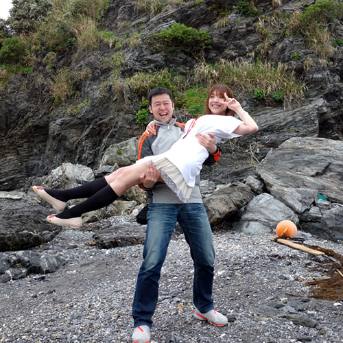 干潮で歩いていける田の子島で、ツアー参加者のえりすさんを…