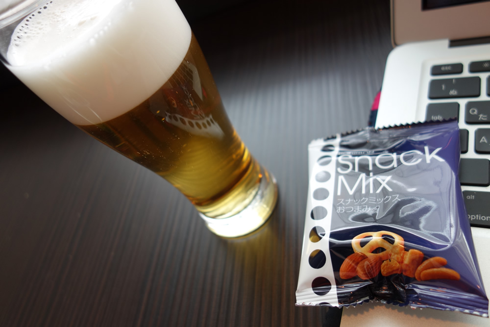 ANAのプレミアムラウンジを利用する餃子の王様・パラダイス山元さんについていき、普段は入れないエリアで、ビールや青汁をいただきつつ、搭乗を待ちます。