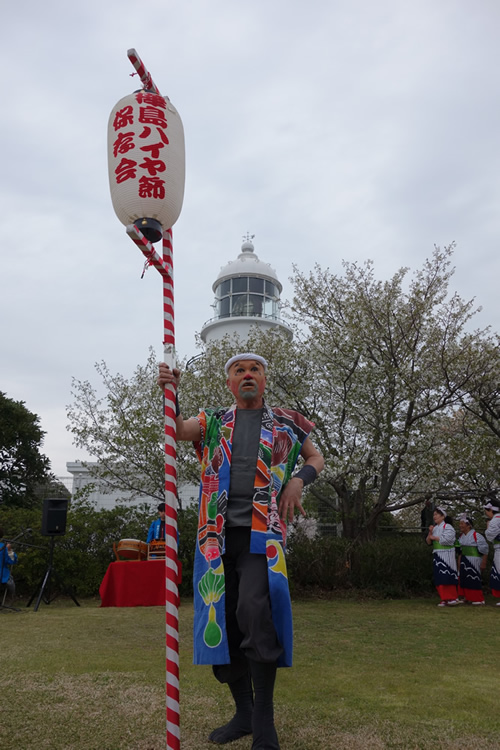 大漁旗を衣装にしたおじさんも登場! なるほど、樺島は漁師の町なんですねぇ。