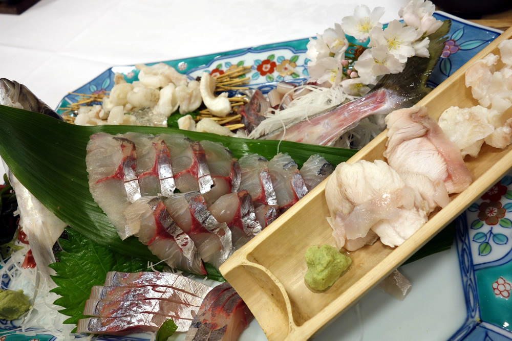 そして、宿泊先に戻ったら晩ごはんです! たくさんのお魚とお酒をいただき、自己紹介などもして普通に終了…