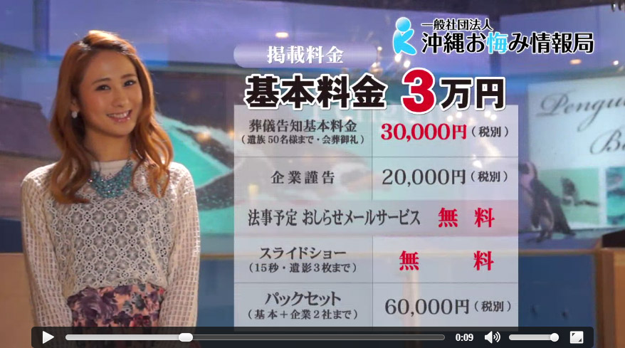 お悔み情報を掲載するのに基本料金は3万円です。15秒のスライドショーもついてます。ミキトニーは笑顔です。
