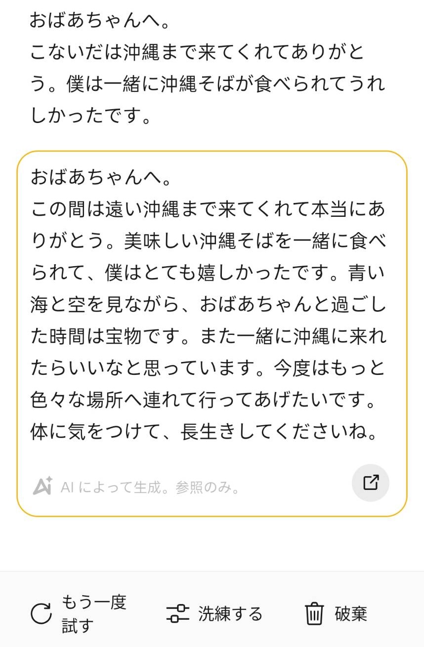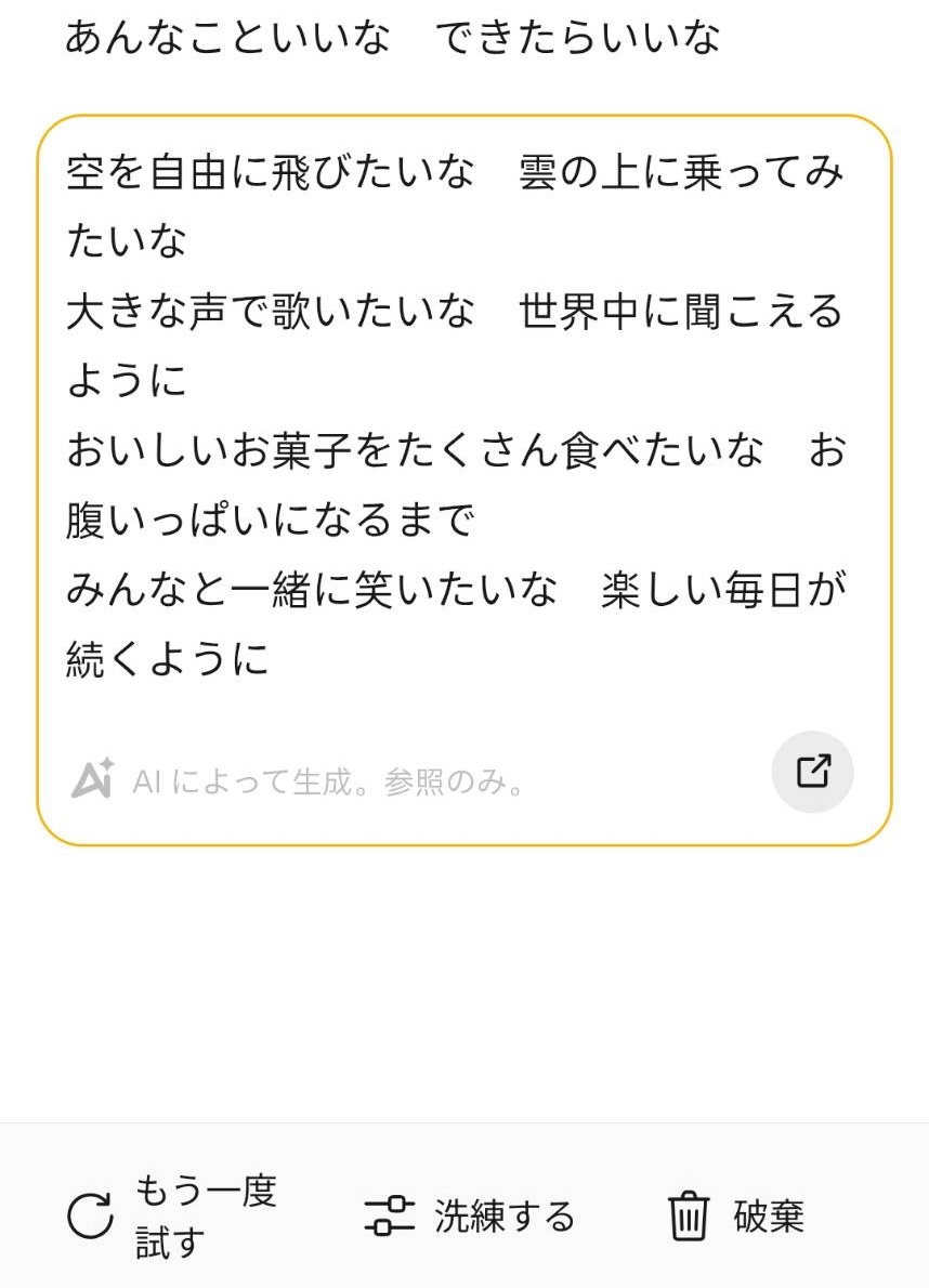 Gemini ではないけどスマホに入っている AI もあって、それもなかなかおもしろかったです。画像生成系は18歳以上じゃないと使えない感じだったので、文章系で遊んでみました。