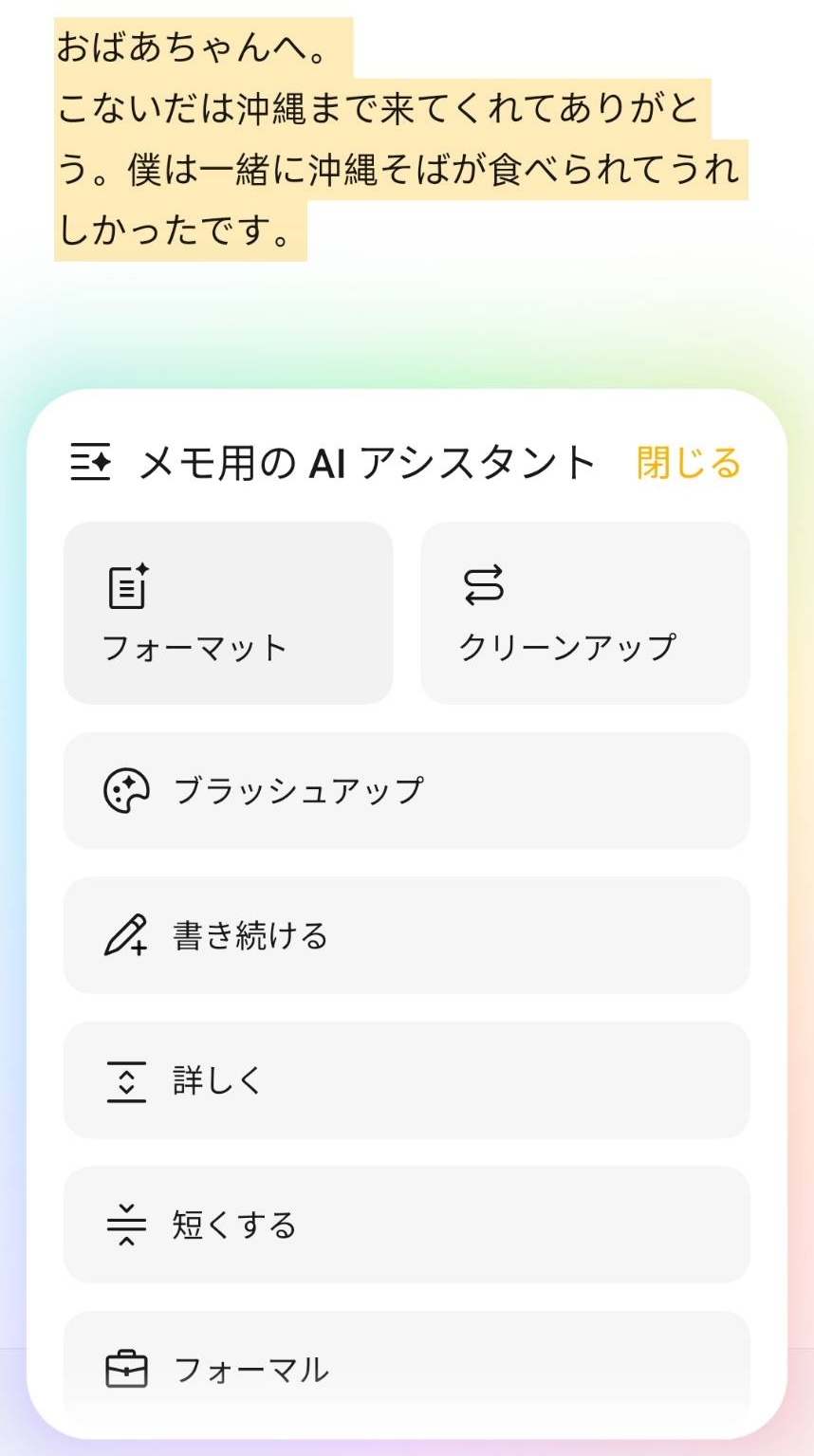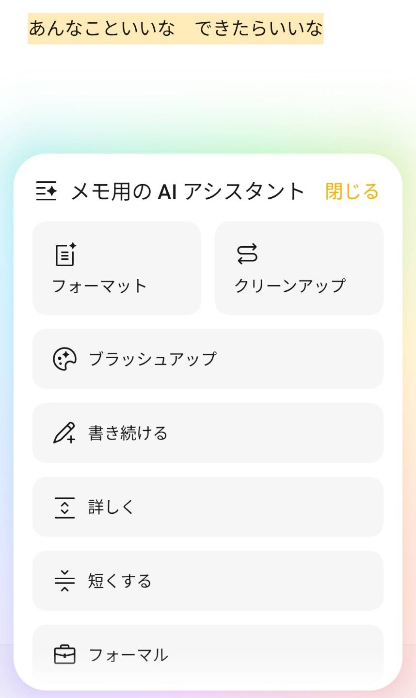例えば、メモアプリで書いた文章を選択して AI アシスタントメニューで指示を出します(画像左)。「詳しく」(画像真中)&「書き続ける」(画像右)はそれぞれこんな出力がありました。