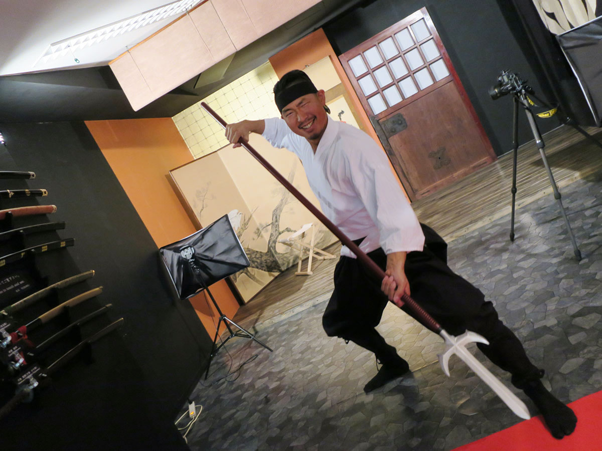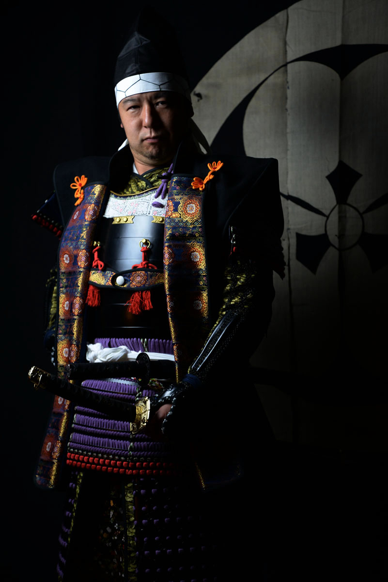 甲冑の重さは約20kgとのことですが、体のいろいろな部位に着いて20kgなので、お米を担ぐような重さではありませんでした。さて、甲冑を着終わったら、いよいよ撮影です!