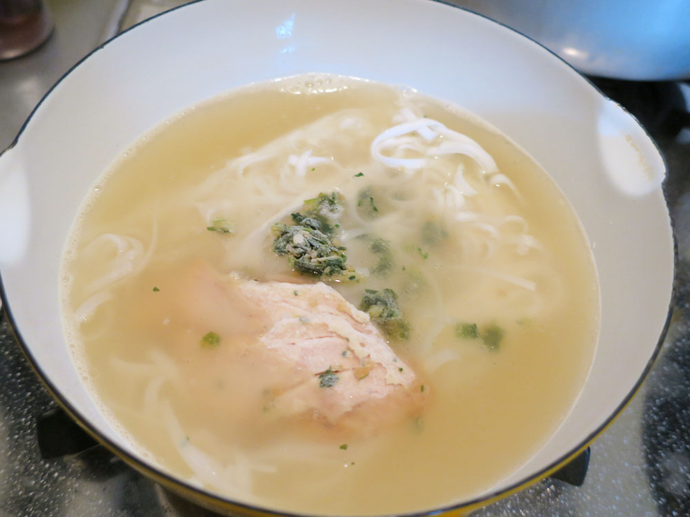 鍋でお湯を沸かし、スープを溶いたら、麺を入れて4分程度、茹でます。中火で熱してたんですが、フォーの水分が多いのか、意外と沸騰せずに時間が経ちました。